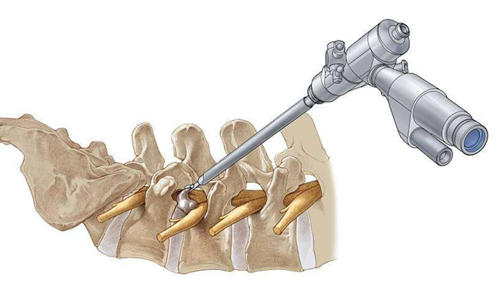 于是乎,聪明的医生们就在想,有没有一种方法,能通过小切口取出突出的椎间盘,解除神经压迫,还不用打螺钉固定,达到刀口小、出血少、费用低、恢复快的目的?在不断地思考研究后,椎间孔镜终于诞生了。它有一个中空的金属管道(椎间孔镜),直径约0.7cm,前端管壁上有灯光照明,还有一个微型摄像头,摄像头连接电脑显示器,通过显示器医生就能清楚看见椎间孔镜前方了,我们将椎间孔镜沿着骨骼和神经间隙植入,并找到突出的椎间盘,然后用配套的钳子通过这个中空的金属管道把突出的椎间盘组织取出来,解除神经压迫。然后退出椎间孔镜,缝合手术伤口。